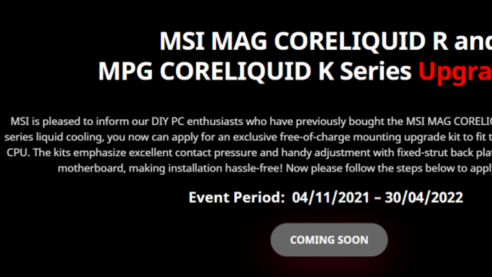 Об этом свидетельствуют данные рекламного материала MSI: в нём говорится, что пользователи двух систем водяного охлаждения (MAG Coreliquid R и MAG Coreliquid K) смогут получить новые комплекты крепления на CPU с сокетом LGA1700 (то есть те самые Alder Lake) уже 4 ноября. Логично думать, что эта дата и является датой официального запуска Alder Lake: в этот день выйдут первые полноценные обзоры новинок, а также стартуют продажи.
