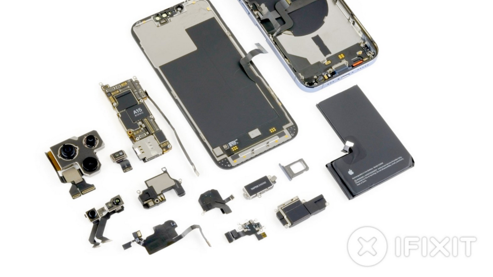 На очень компактной системной плате разместились SoC Apple A15 Bionic, совмещённая с 6 ГБ ОЗУ производства Hynix, модуль Apple U1, контроллер питания Apple APL1098, модули Skyworks SKY58276-17 и Skyworks SKY58271-19, микросхема флеш-памяти Kioxia, модем Qualcomm SDX60 5G и ряд других элементов.