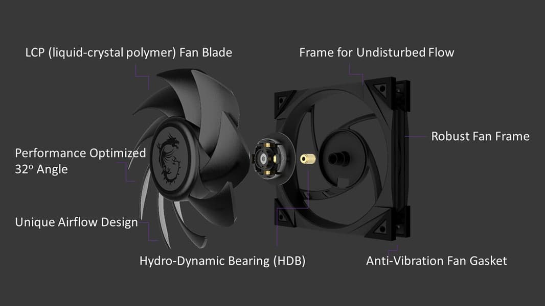 Лопасти упомянутых выше вентиляторов изготовлены из жидкокристаллического полимера (LCP) — плотного пластика с малым коэффициентом теплового расширения. Их форма обеспечивает максимальный воздушный поток. Для снижения шума и увеличения срока службы ротор опирается на гидродинамический подшипник. В углах рамки вентилятора запрессованы антивибрационные втулки. Скорость вращения регулируется в диапазоне 0–2000 об/мин. Максимальным оборотам соответствует поток 95,54 м3/ч и уровень шума 22,7 дБА.