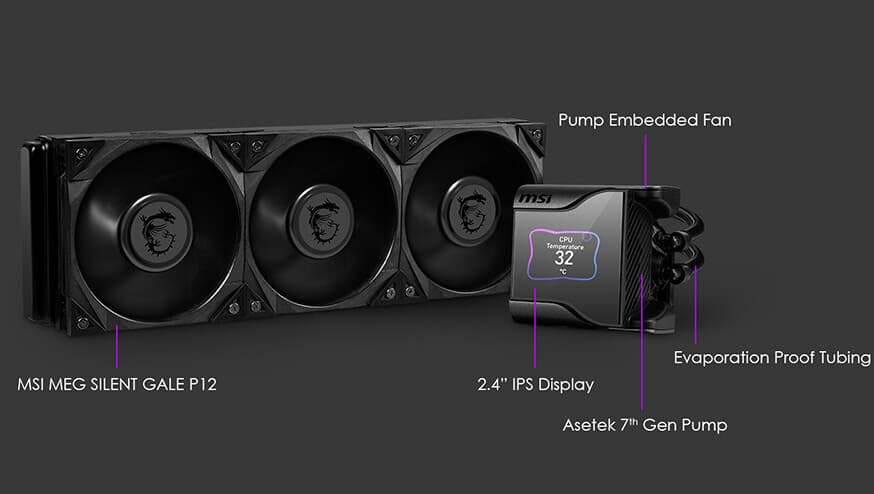 Компания MSI представила серию систем жидкостного охлаждения MEG CoreLiquid S, разработанных в сотрудничестве с Asetek. Серия включает две модели с алюминиевыми радиаторами длиной 280 мм и 360 мм. На радиаторах установлены малошумные вентиляторы MSI серии MEG Silent Gale, включающиеся только при необходимости, а в крышку помпы встроен дисплей типа IPS размером 2,4 дюйма по диагонали. Помпа Asetek 7-го поколения отличается повышенным сопротивлением протечкам и увеличенной долговечностью.