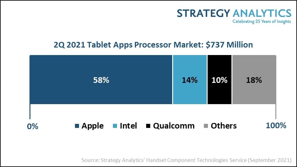 По данным Strategy Analytics, рынок процессоров для планшетов во втором квартале 2021 года вырос по сравнению с аналогичным периодом прошлого года на 17%, до 737 млн долларов.