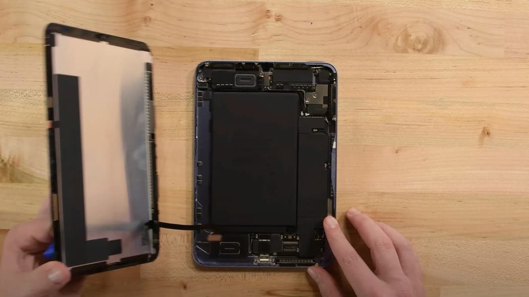 Разборка начинается с нагрева экрана, и тут надо быть очень осторожным, чтобы не повредить матрицу. Далее отключается пара шлейфов дисплея и шлейф аккумулятора. Однако снять аккумулятор просто так не получится, он прочно вклеен. И это одна из причин снижения рейтинга ремонтопригодности. А вообще специалисты отмечают, что Apple будто сознательно усложняет возможность ремонта своего самого маленького планшета. Впрочем, конкретно в этой модели есть один плюс: разъём USB-C выполнен модульным.