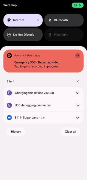 Функция позволяет пользователю настроить пятикратное нажатие кнопки питания смартфона. На выбор есть несколько вариантов: вызов экстренных служб, отправка различных данных, включая текущее местоположение, на зарезервированные номера или запись видео. В последнем случае видеозапись может длиться до 45 минут и автоматически сохраняется в облачном хранилище. Видео достаточно сильно сжато, поэтому 1 минута занимает около 10–15 МБ. После загрузки видео может быть автоматически отправлено на указанные контакты.