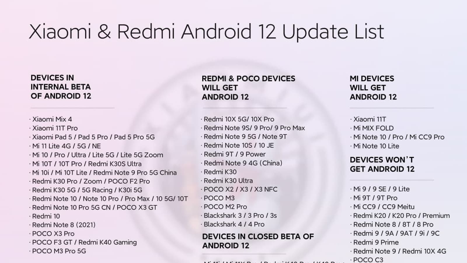 В Сети появился обновленный список смартфонов Xiaomi, Redmi и Poco, которые получат Android 12. Он составляет на основе данных, поставляемых изнутри Xiaomi и китайского сообщества пользователей MIUI: до тех пор, пока сама Xiaomi не обнародует планы по обновлению своих устройств до Android 12, этот перечень можно считать самым достоверным.