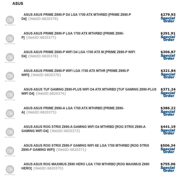 | Стоимость системных плат Asus на чипсетах Intel Z690 и Intel Z590 | ||||
