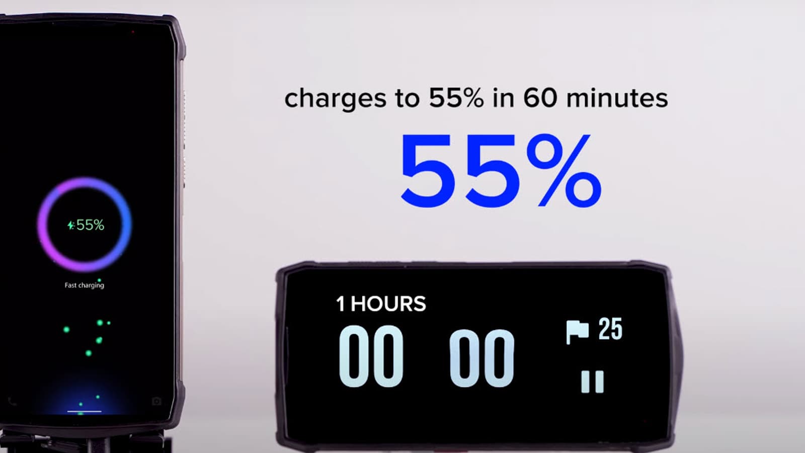 Видеоролик, опубликованный производителем, демонстрирует замер времени зарядки смартфона при помощи блока питания мощностью 33 Вт. За первые 10 минут смартфон заряжается на 10%, за полчаса уровень заряда достигает 30%. В течение часа смартфон можно зарядить на 55%, то есть более чем на 7000 мА•ч, что очень и очень неплохо. За полтора часа смартфон заряжается до 76%. Через два часа уровень заряда достигает 85%, а полная зарядка смартфона занимает три часа.