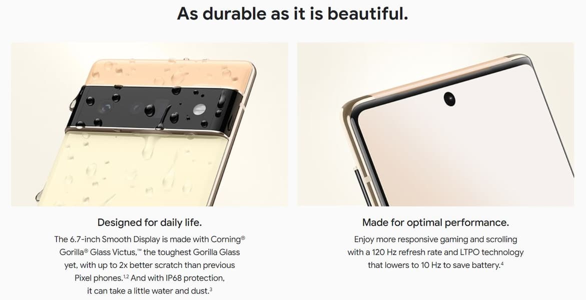 Другой важный момент: оба смартфона получили крепкое стекло Gorilla Glass Victus, защищающее дисплей, а также защиту от пыли и воды в соответствии со степенью IP68. Обе модели поддерживают проводную зарядку мощностью 30 Вт, заявленная автономность – более 24 часов «даже с 5G». Скорости беспроводной зарядки немного разнятся: 21 Вт (Pixel 6) и 23 Вт (Pixel 6 Pro). Устройства совместимы с зарядными устройствами стандарта Qi.