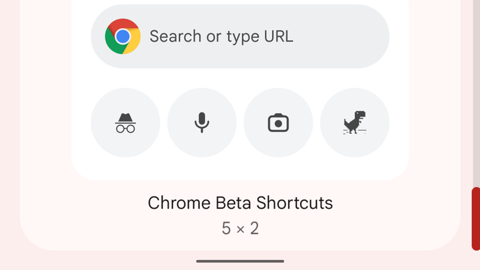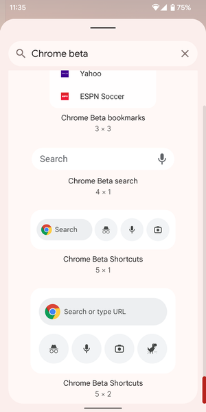 Новых виджетов три. Первый имеет размеры 5х1 с быстрым доступом к поисковой системе, просмотру в режиме инкогнито и голосовому поиску.