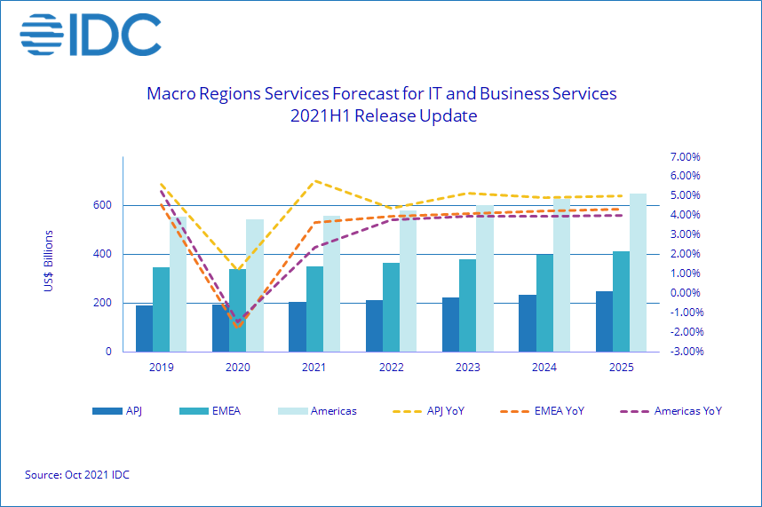 Приведенные выше значения близки к значениям, приведенным в апрельском прогнозе IDC. Напомним, тогда аналитики ожидали, что рост в 2021 составит около 4%. Для сравнения: в 2020 году мировая выручка от IT-сервисов и бизнес-сервисов сократилась на 1,16%, а если учесть изменения обменного курса, то и вовсе на 1,53%. В абсолютном выражении рынок не превысил 1 трлн долларов.