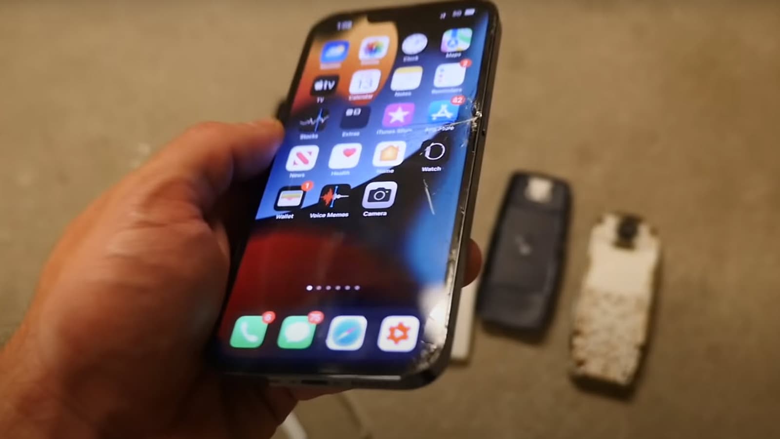Заднее защитное стекло и лицевая панель постепенно разбивались всё сильнее, однако тесты показали, что iPhone 13 Pro собран очень хорошо. В итоге смартфон остался в рабочем состоянии.