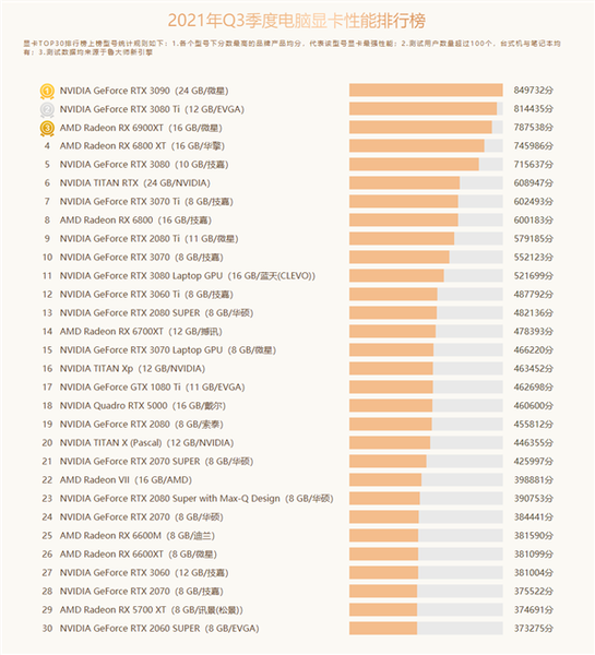 Разработчики бенчмарка Master Lu, сверхпопулярного в Китае, опубликовали рейтинг потребительских видеокарт за третий квартал 2021 года, и в нем есть кое-что интересное. В Топ-10 по-прежнему нет ни одной видеокарты AMD – ни бюджетной (относительно) Radeon RX 6700 XT, ни уж тем более Radeon RX 6800 или 6900. По сути, рынок потребительских решений монополизирован Nvidia. Но вот что интересно: на фоне дефицита и заоблачной стоимости дискретных видеокарт первое место рейтинга занял мобильный GPU. Это GeForce RTX 3060. Второе место за бюджетной моделью GeForce GTX 1650 для настольных ПК, что ожидаемо. А вот на третьем месте еще один мобильный GPU – GeForce RTX 3050 Ti.