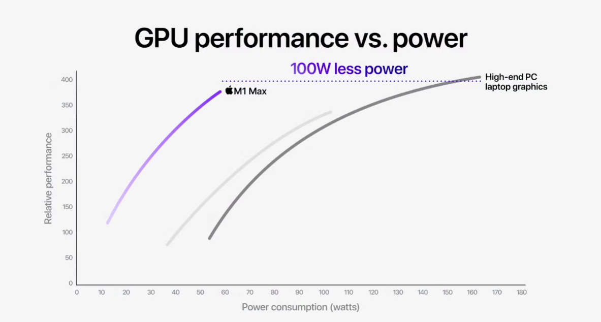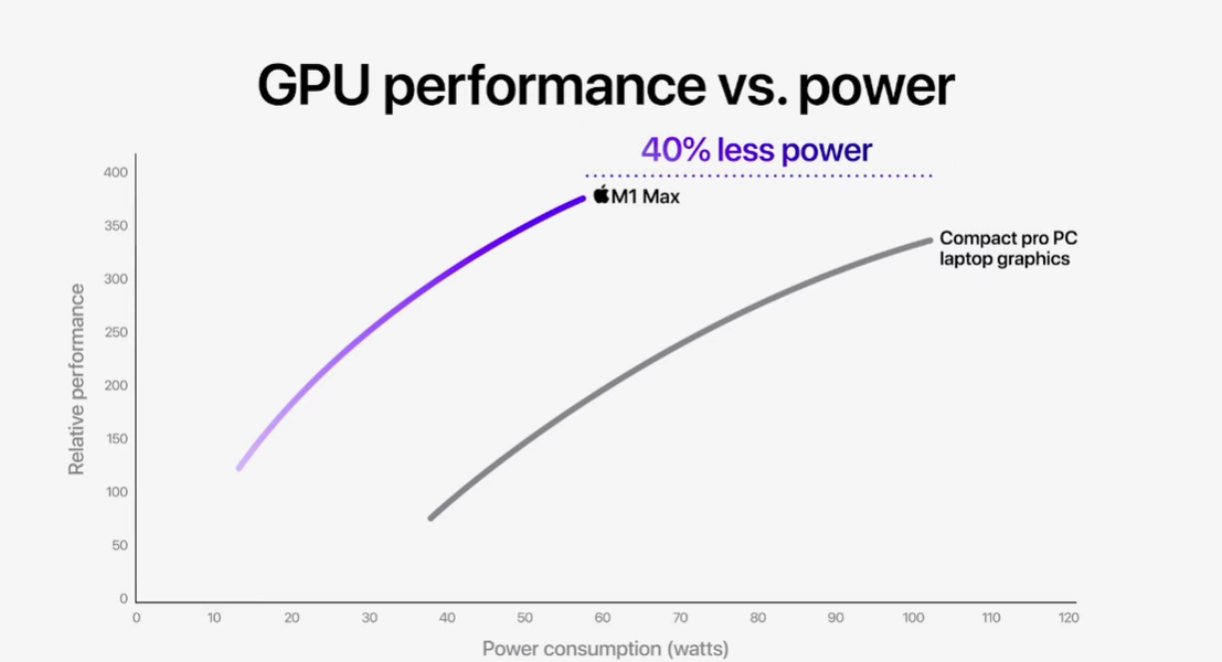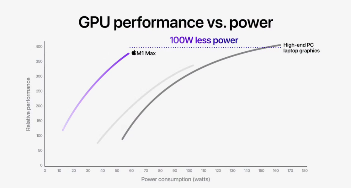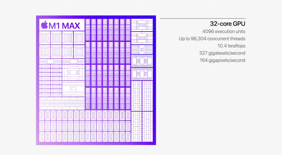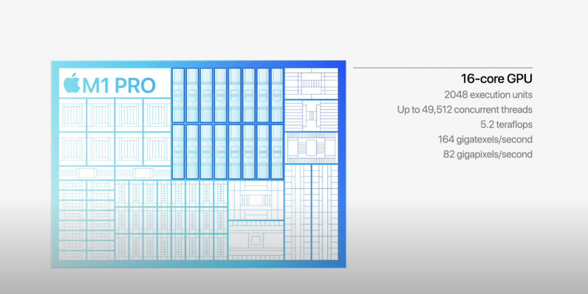 При этом у обеих платформ процессоры идентичны. Это восемь высокопроизводительных и два энергоэффективных ядра. Частоты Apple пока не указывает. Что отличается, так это GPU. В M1 Pro графическое ядро содержит 16 ядер, а в M1 Max — уже 32 ядра. Это 2048 и 4096 исполнительных блоков соответственно. Напомним, у M1 графических ядер лишь 8. Производительность GPU соответственно составляет 5,2 и 10,4 TFLOPS. Для сравнения, производительность в 10,6 TFLOPS у видеокарты Radeon RX 6600 XT. Правда, с реальной производительностью в играх и приложениях это зачастую никак не связано, но для однокристальной системы всё равно впечатляет.