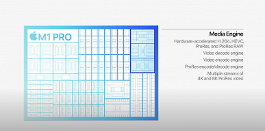 Младшая из новых SoC объединена с 32 ГБ оперативной памяти с пропускной способностью 200 ГБ/с, а старшая предлагает уже 64 ГБ с 400 ГБ/с пропускной способности. Кроме того, у M1 Max относительно M1 Pro удвоенное количество некоторых блоков для кодирования и декодирования видео, в том числе для видео в формате ProRes.