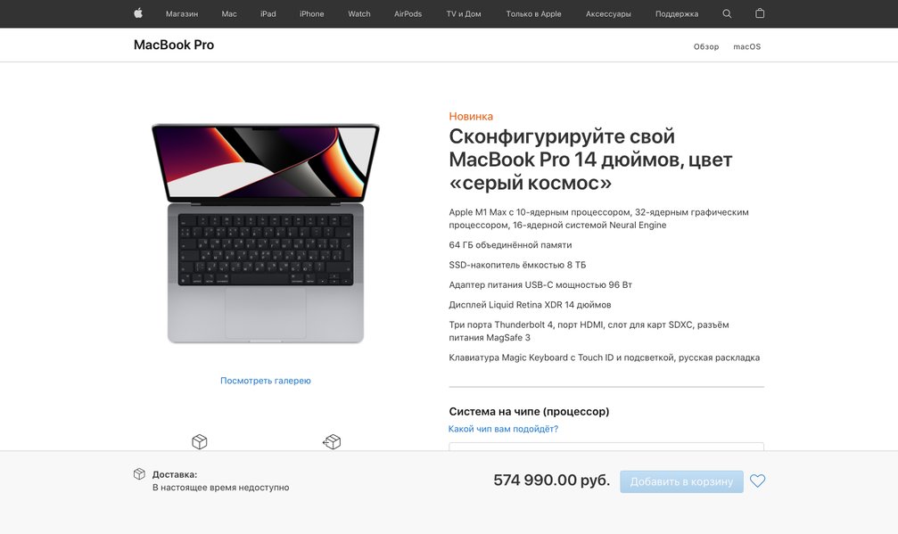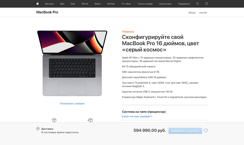 MacBook Pro на 16 дюймов предлагаются такие опции: 10-ядерный Apple M1 Max с 24-ядерной графикой (плюс 20 тысяч рублей), 10-ядерный Apple M1 Max с 32-ядерной графикой (плюс 40 тысяч рублей), 32 или 64 ГБ ОЗУ (40 или 80 тысяч рублей дополнительно), SSD на 1–8 ТБ (от 20 до 240 тысяч рублей дополнительно). Таким образом, максимальная комплектация будет стоить 594 990 рублей.