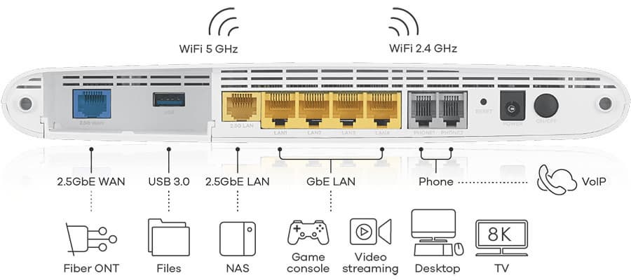 Оснащение Zyxel EX5501 включает порт WAN 2.5GbE, порт USB 3.0, порт LAN 2.5GbE, который предлагается использовать для подключения NAS, четыре порта GbE и два разъёма для подключения телефонных аппаратов (VoIP). Поддерживая Wi-Fi 6, роутер обеспечивает скорость до 4,8 Гбит/с в диапазоне 5 ГГц и до 1,1 Гбит/с в диапазоне 2,4 ГГц. Что касается поддержки функций ячеистой сети, роутер можно использовать в составе существующей сети или для организации новой, для чего понадобится один или несколько расширителей покрытия WX3401-B0. Цену новинки производитель не называет.