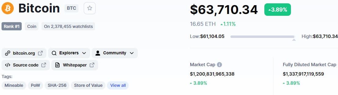 Bitcoin продолжает дорожать. Пускай и не так быстро, как хотелось бы многим, но довольно уверенно: за 1 BTC сейчас дают больше 63 500 долларов. До обновления исторического рекорда в 64 800 долларов, установленного в этом году, остаётся всего ничего.