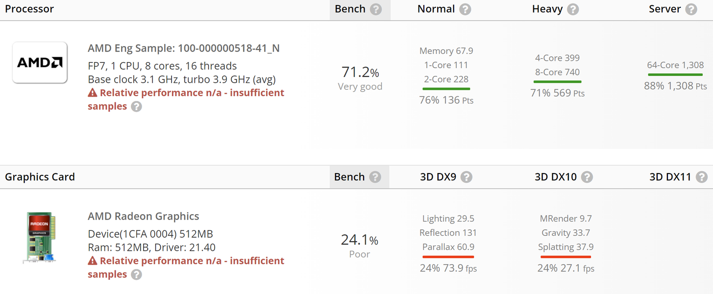 У тестового процессора восемь ядер с поддержкой SMT и частоты 3,9–4,1 ГГц. Результат бенчмарка не впечатляет: 111, 228 и 740 баллов в режиме с одним, двумя и восемью активными ядрами. Для сравнения: нынешний Ryzen 7 5800H набирает соответственно 132, 256 и 875 баллов. Но тестировался, вероятно, несерийный образец, так что результаты пока можно не рассматривать.