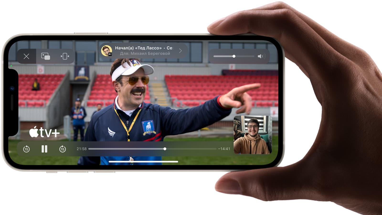 Фактически это функция совместного просмотра или прослушивания, когда любой участник звонка может приостанавливать, запускать и перематывать контент, пользуясь общими элементами управления, а громкость фильма или песни автоматически уменьшается, когда собеседники начинают говорить. С Apple TV можно смотреть общее видео на большом экране, продолжая общение по FaceTime на iPad.