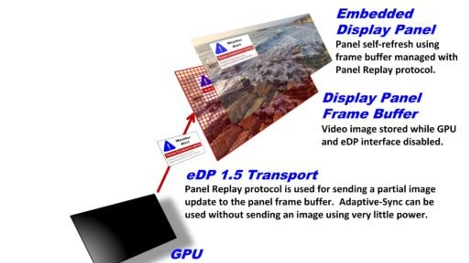 Как и предыдущая версия, eDP 1.5 поддерживает самообновление панели — ключевую функцию энергосбережения, заложенную в стандарте. При самообновлении панели статические изображения сохраняются в памяти дисплея, когда другие части системы переходят в состояние ожидания с низким энергопотреблением. Система может просыпаться на короткие промежутки времени для обновления всего дисплея или его части по мере необходимости. Этим обеспечивается значительная экономия энергии в типичных приложениях для ноутбуков или планшетов. В eDP 1.5 функция самообновления панели дополнительно оптимизирована добавлением расширенного протокола Panel Replay. Во время самообновления графический процессор и интерфейс eDP 1.5 переходят в состояние с пониженным энергопотреблением для экономии заряда батареи. В eDP 1.5 также добавлена поддержка протокола для новых типов панелей, таких как некоторые панели OLED с уменьшенным периодом регенерации без потребности в буфере кадра.
