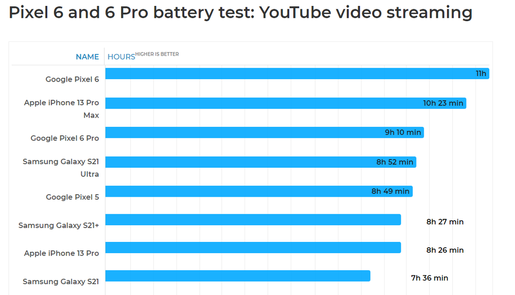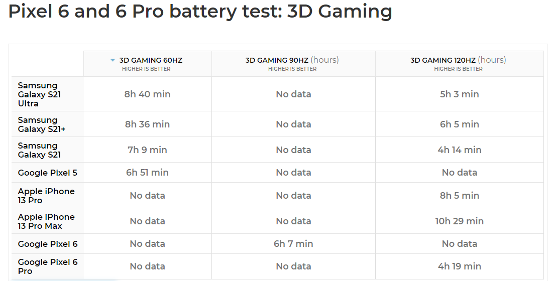 Как видим, при проигрывании видео в YouTube младший Pixel 6 обошёл даже iPhone 13 Pro Max, который сейчас является одним из лучших флагманов по автономности. Да и старший Pixel 6 Pro показал себя отлично, обойдя и iPhone 13 Pro, и флагманы Samsung. А вот играх iPhone 13 Pro Max попросту недостижим, да и в целом новинки Pixel в этом режиме показывают себя не особо хорошо.
