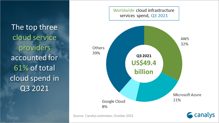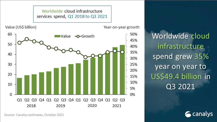Спрос на сервисы облачной инфраструктуры продолжают расти. Мировые расходы по этой статье в третьем квартале 2021 года достигли рекордной суммы 49,4 млрд долларов, увеличившись в годовом выражении на 35%. Такие данные содержатся в отчёте, подготовленном специалистами аналитической компании Canalys.