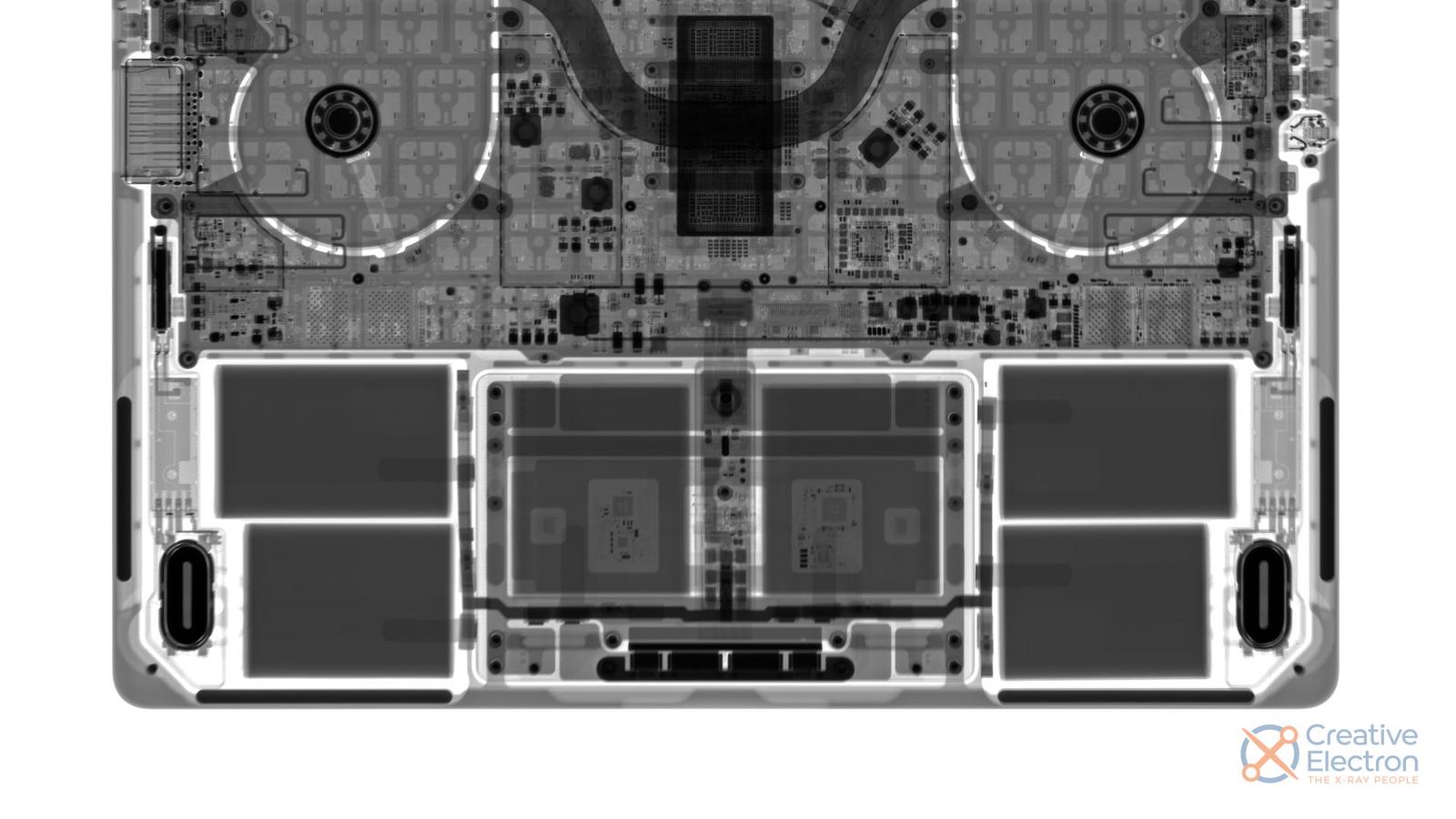 В целом между младшей и старшей моделями новых MacBook Pro с точки зрения конструкции разницы практически нет. Аккумуляторы имеют ёмкость 69,6 и 99,6 Вт•ч соответственно, и в обоих случаях это целая гирлянда из шести элементов.