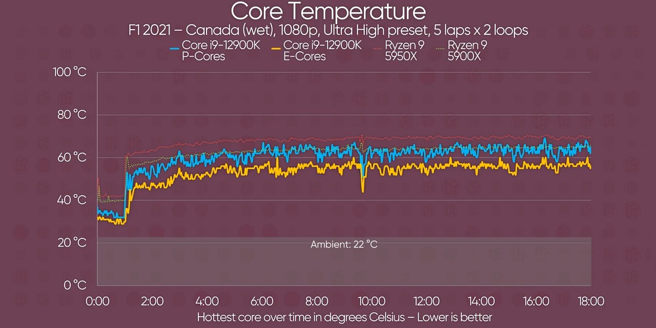 Аналогичная картина наблюдается в части нагрева: при большой нагрузке Core i9-12900K нагревается сильнее Ryzen 9 5950X и Ryzen 9 5900X, а вот в играх нагрев примерно одинаков.