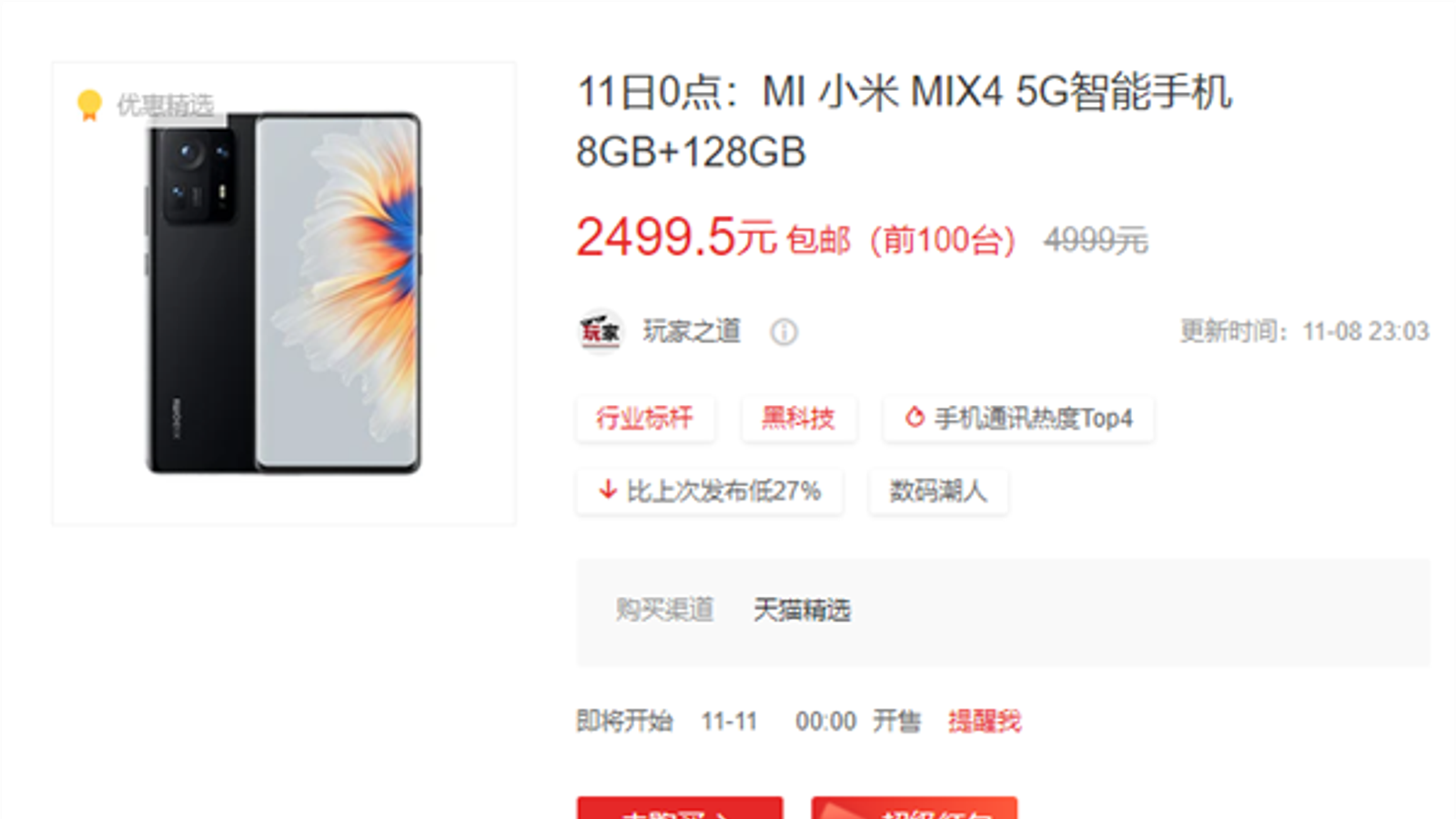 Распродажа стартует 11 ноября, ровно в 00:00 по местному времени. В ней участвует 11 моделей смартфонов, причем все топовые. В их числе — Mi 11, Mi 11 Pro, Mi 11 Ultra, Mi 10S, Mix 4, Redmi K40, Redmi K40 Pro. Первые 100 человек, которые нажмут на кнопку «Купить» на страничке каждой из этих моделей, получат смартфон за полцены. Так, к примеру, Mix 4 с 8 ГБ ОЗУ и 128 ГБ флеш-памяти вместо 780 долларов обойдётся всего лишь в 390 долларов.