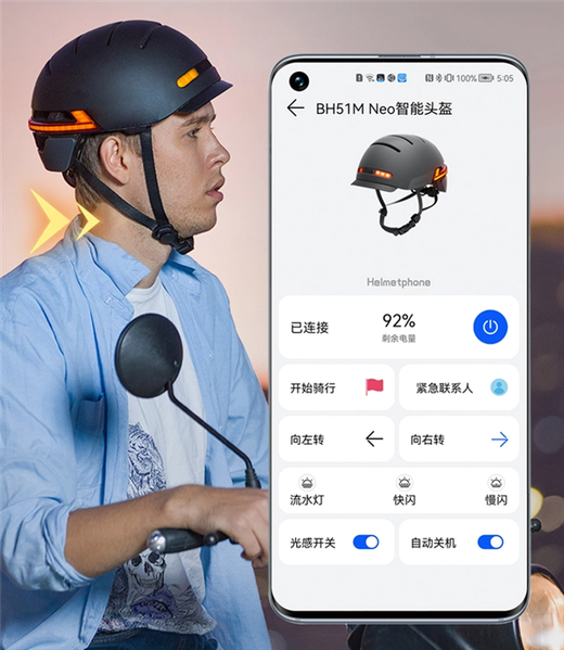 Умный шлем работает на основе фирменной операционной системы HarmonyOS. Шлем сопрягается со смартфонами в одно касание. После сопряжения на смартфоне можно проверить заряд аккумулятора, установить контакты для экстренных случаев, а также настроить режим работы светодиодных сигналов. Также в шлеме есть стереодинамики для воспроизведения музыки и звонков в режиме громкой связи.