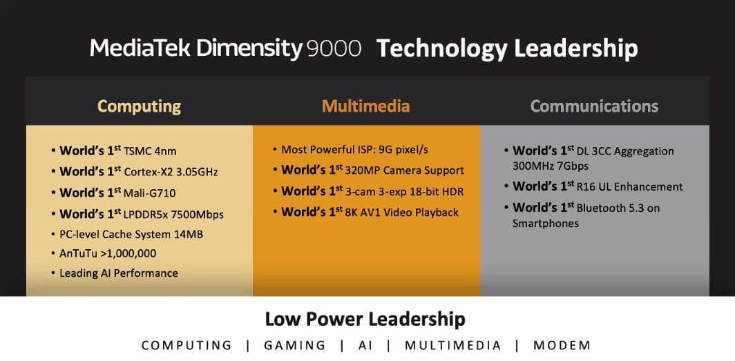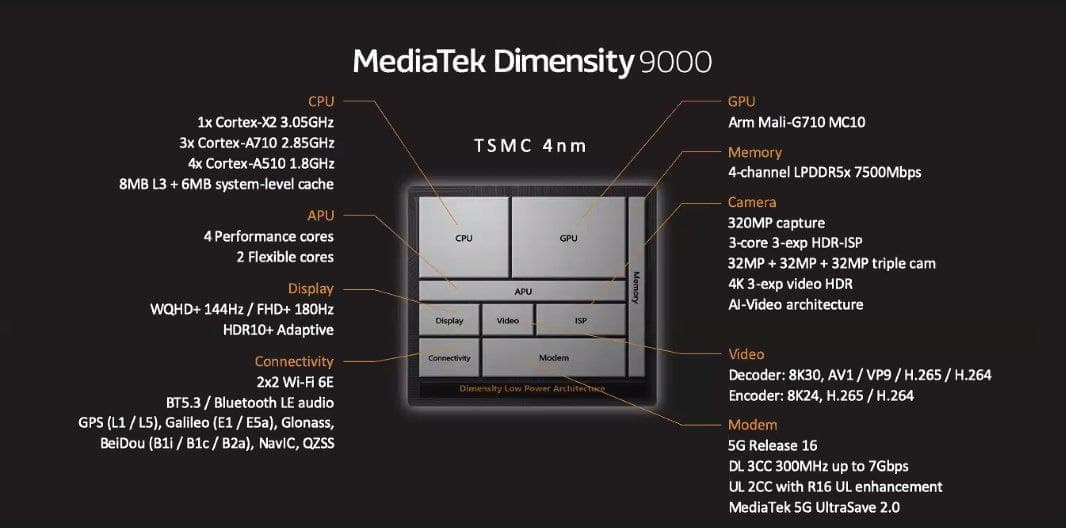 Как и предполагалось, MediaTek сегодня представила однокристальную систему Dimensity 9000 — флагманскую платформу для смартфонов 2022 года. В одном новинка выгодно отличается от платформ Qualcomm и Apple — это первая в мире SoC, производимая по техпроцессу 4 нм. Теоретически это даёт ей преимущество в плане более низкого энергопотребления. Впрочем, разница c 5-нанометровыми SoC Qualcomm и Apple невелика. Производство Dimensity 9000 доверено TSMC, готовые устройства на базе новой платформы обещаны уже в первом квартале 2022 года, то есть флагманы на Snapdragon 898 и Dimensity 9000 появятся практически одновременно.