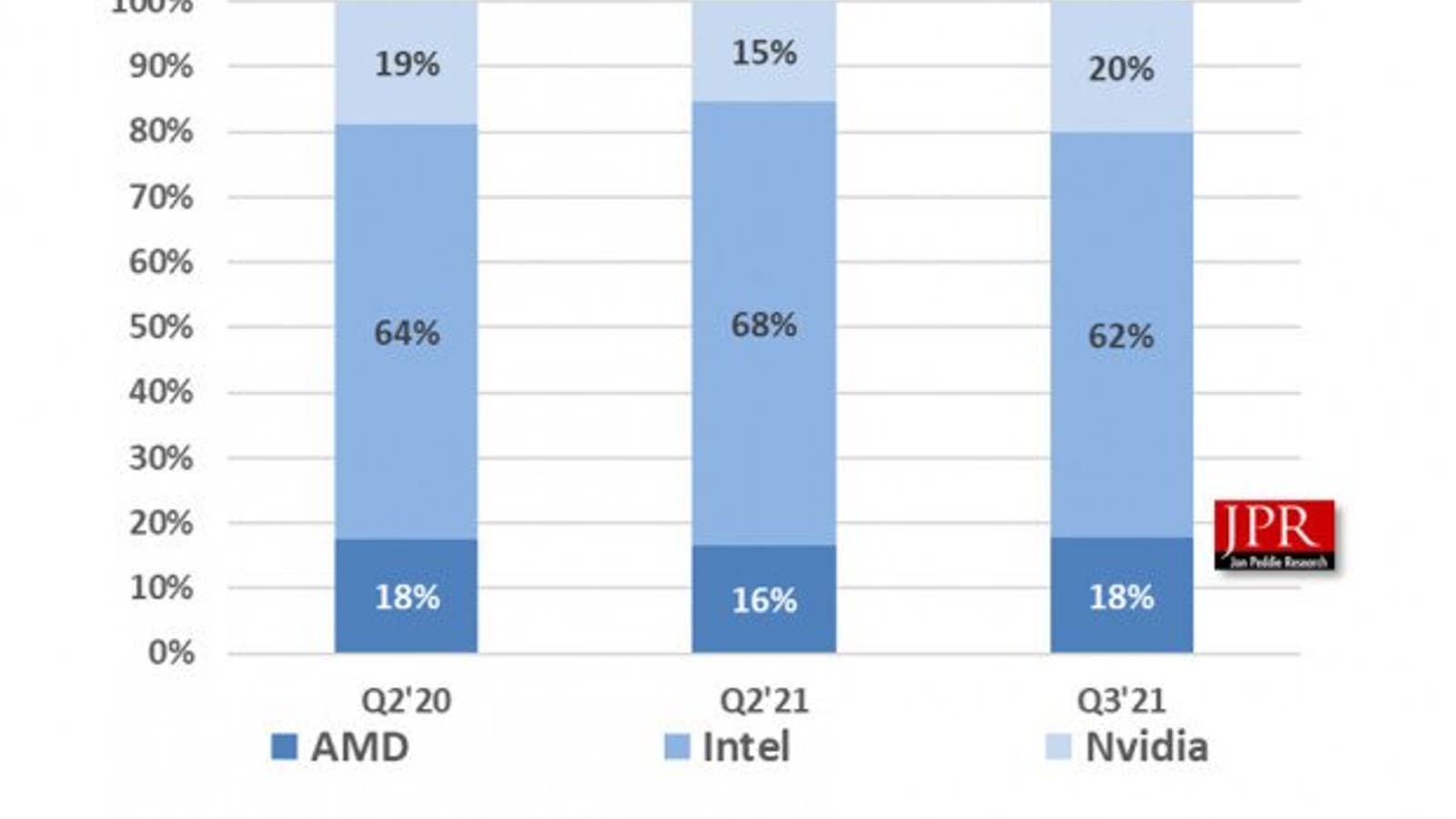 Крупнейшим участником рынка остаётся компания Intel, но она сократила поставки на 25,6%. Компания AMD сократила поставки на 11,4%, а компания Nvidia смогла нарастить поставки на 8,0%. По итогам квартала Intel занимает 62% рынка, AMD — 18%, Nvidia — 20%.