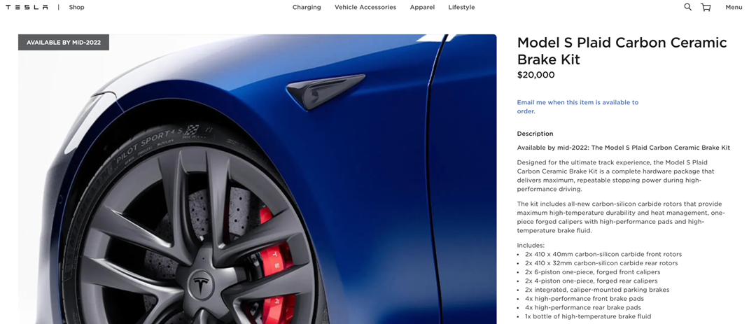 Ранее Tesla обещала представить трек-комплект для Model S Plaid и, вероятно, карбон-керамические тормоза — первая часть этого комплекта. Важно отметить, что в продажу такой аксессуар поступит только в 2022 году, а использовать его можно только с дисками диаметром 21 дюйм.