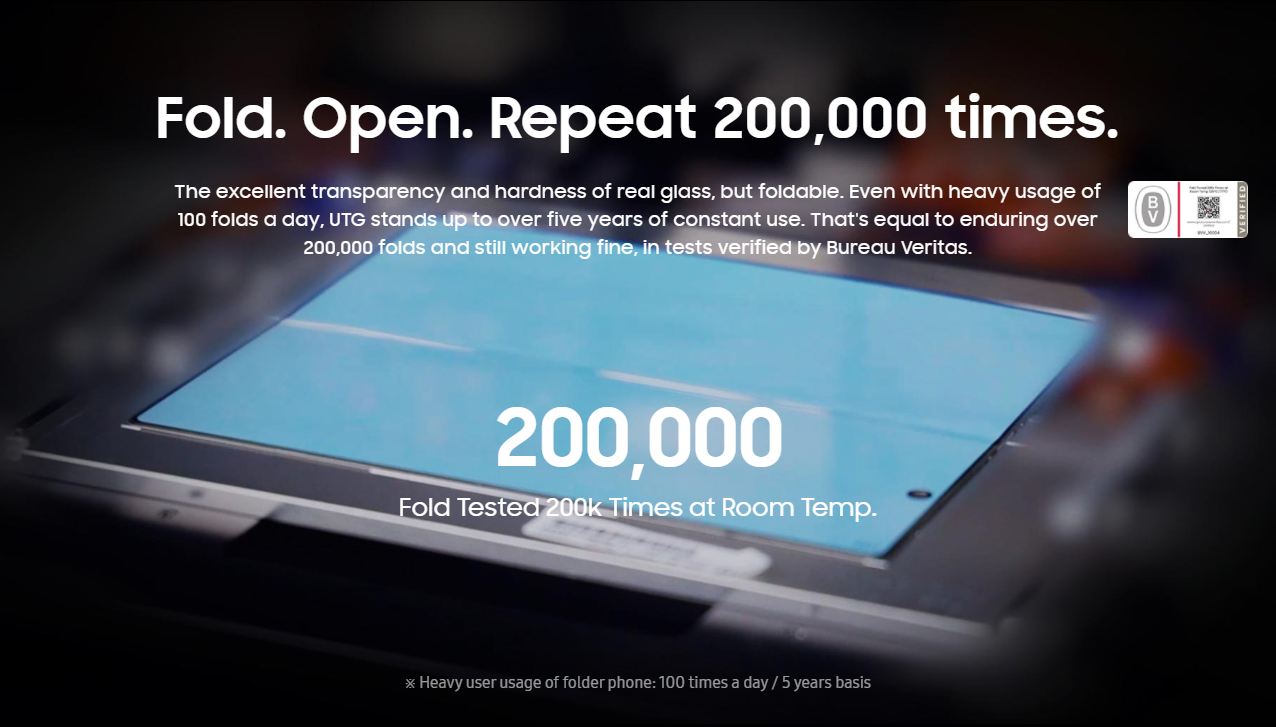 Новый экран покрыт ультратонким стеклом UTG, чтобы существенно повышает долговечность и качество отображения. Производитель заявляет, что это покрытие твёрдое, как стекло, и гибкое, как плёнка. Возможно, оно также позволит уменьшить видимость складки в месте сгиба.
