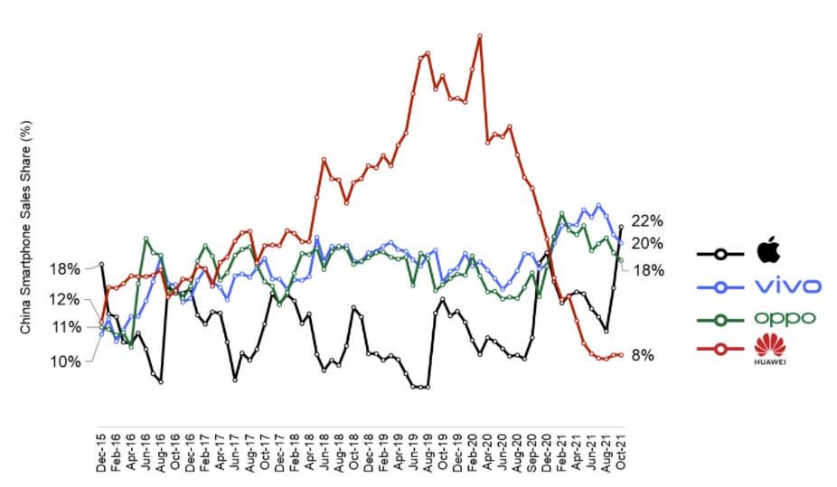 Согласно данным ежемесячного отсчета Counterpoint Research, в октябре 2021 года компания Apple превзошла Vivo по продажам смартфонов в Китае и заняла первое место на крупнейшем рынке этих устройств. Это произошло впервые с декабря 2015 года. Благодаря серии iPhone 13 продажи смартфонов Apple выросли по сравнению с предыдущим месяцем на 46%, что является самым высоким показателем среди основных поставщиков. Для сравнения: в целом рынок смартфонов в Китае в октябре вырос всего на 2%. У других ключевых производителей объем продаж в октябре снизился по сравнению с предыдущим месяцем.