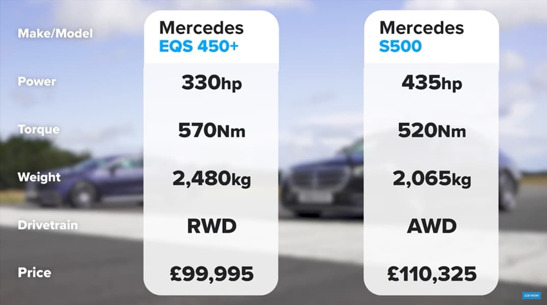 Авто выбирались, судя по всему, по относительному равенству цены: за EQS 450+ в Великобритании, где и устраивали заезды, просят 100 000 фунтов, S500 4MATIC на 10 000 фунтов дороже. Электрический седан – заднеприводный, его силовая установка выдает 330 л.с., бензиновая версия полноприводная, ее мощность – 435 л.с. Но гораздо важнее то, что тяговая аккумуляторная батарея емкостью чуть более 100 кВт·ч сделала EQS 450+ очень тяжелым: его масса составляет 2,5 тонны против 2,065 тонн у S500 4MATIC с двигателем объемом 3,0 л. По большому счету, именно разница в массе и предопределила исходы заездов.
