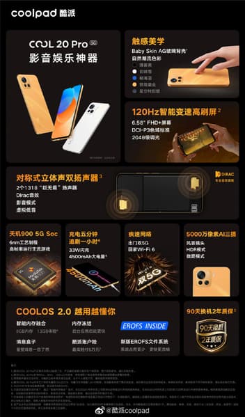 Основная камера представлена датчиками разрешением 50, 8 и 2 Мп. Ёмкость аккумулятора составила 4500 мА·ч, поддерживается быстрая зарядка мощностью 33 Вт. Из других особенностей новинки — ОС Android 11 с интерфейсом CoolOS 2.0, адаптер Wi-Fi 6, стереодинамики, стандартный разъём для наушников. Толщина Cool 20 Pro составляет 8,3 мм, масса — 193 грамма.