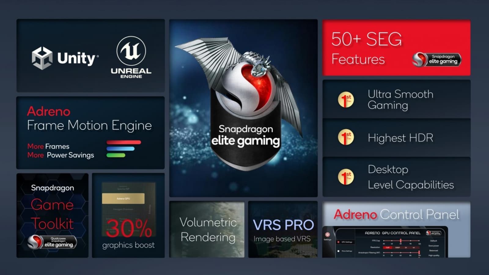 В описании Snapdragon 8 отмечено наличие более чем 50 игровых функций Snapdragon Elite. Они обеспечивают «сверхплавную реакцию, насыщенные цветом HDR-сцены с высочайшим визуальным качеством и возможности уровня настольных компьютеров». Так, новый графический процессор Qualcomm Adreno обеспечивает прирост возможностей графического рендеринга на 30% и улучшение энергосбережения на 25% по сравнению с предыдущим поколением.
