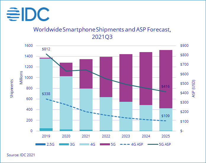 В то же время на рынке есть сегмент, растущий гораздо быстрее. Это аппараты с поддержкой 5G. Ожидается, что в этом году устройств 5G будет отгружено на 117% больше, чем в прошлом году. При этом переход на 5G приводит к увеличению доходов для большинства поставщиков по сравнению с более доступными устройствами 4G, поставки которых сократятся на 22,5%. Средняя цена смартфона 5G в 2021 году прогнозируется равной 643 долларам, что на 1,7% выше, чем в 2020 году. Для сравнения: средняя цена смартфона с поддержкой 4G в 2021 году составит 204 доллара, уменьшившись по сравнению с 2020 годом на 26,5%.