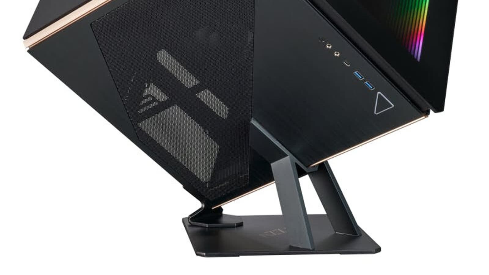 Панели корпуса изготовлены из тонированного закаленного стекла и матовой алюминиевой сетки, а в ребра выделены золотистой отделкой. Комплектная подставка удерживает корпус в приподнятом положении, обеспечивая хороший обзор и вентиляцию.
