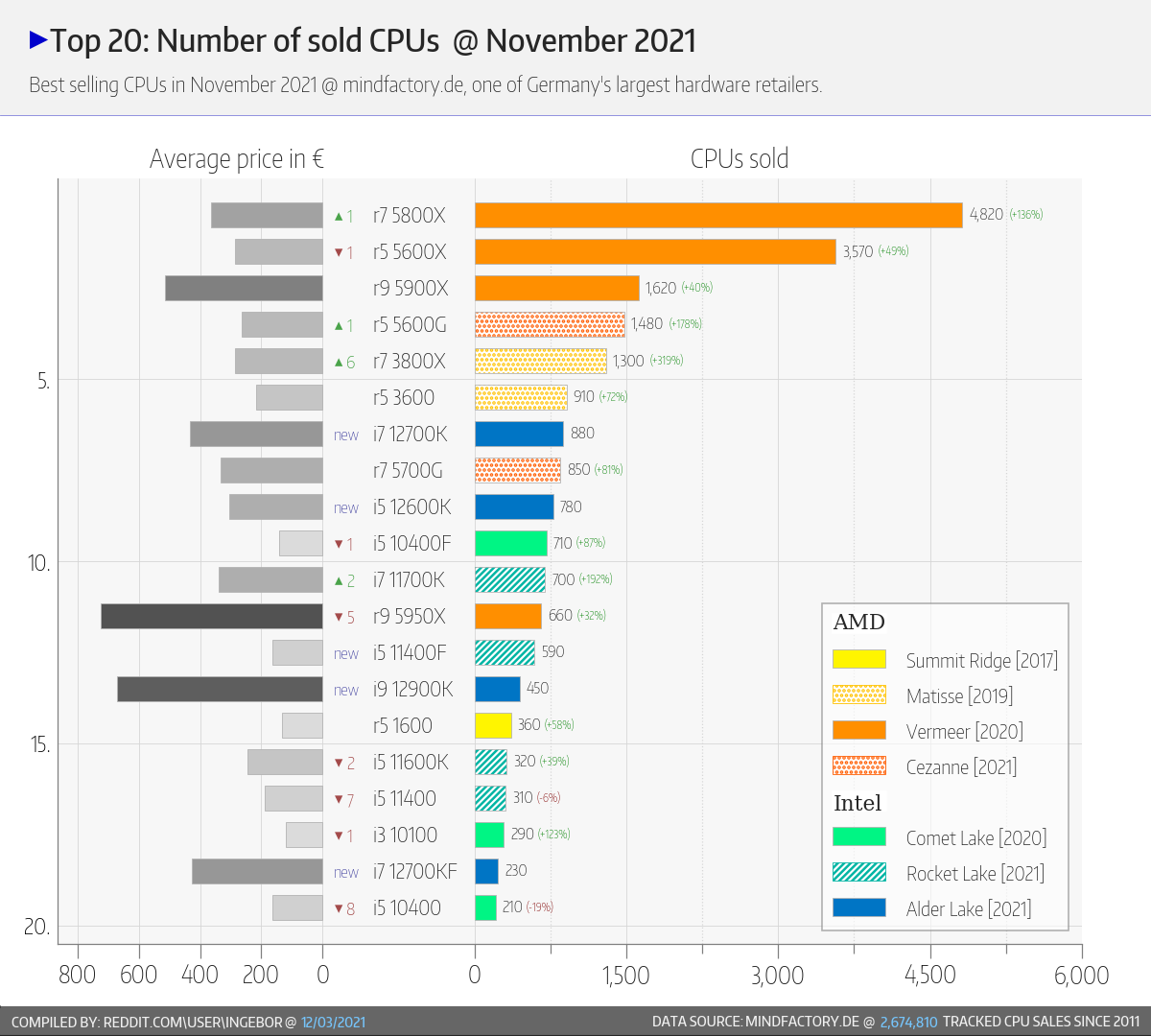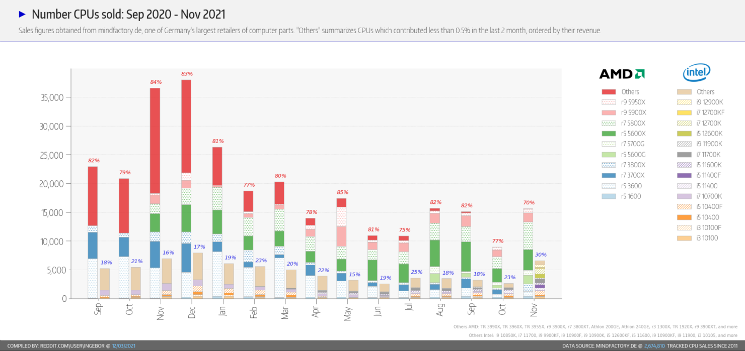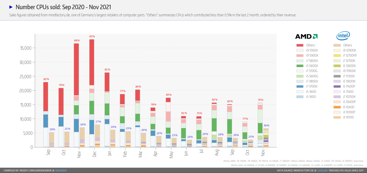 Если посмотреть на самые продаваемые CPU, то в списке лидеров лучший процессор Intel занимает пока лишь седьмое место. Это Core i7-12700K, которых за ноябрь магазин продал 880 штук. Для сравнения, лидер Ryzen 7 5800X разошёлся в количестве 4820 штук, и даже Ryzen 5 3600 обошёл новичка Intel. Стоит отдельно акцентировать внимание на том, что лидером стал именно Ryzen 7 5800X, тогда как большую часть года таковым был Ryzen 5 5600X.