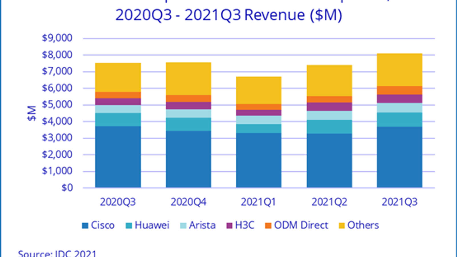 Специалисты аналитической компании IDC подвели итоги третьего квартала 2021 года на рынке коммутаторов Ethernet. Они утверждают, что в годовом выражении продажи выросли на 7,5% и достигли 8,1 млрд долларов. Продажи маршрутизаторов корпоративного уровня в годовом выражении выросли на 4,7% и достигли 3,8 млрд долларов.