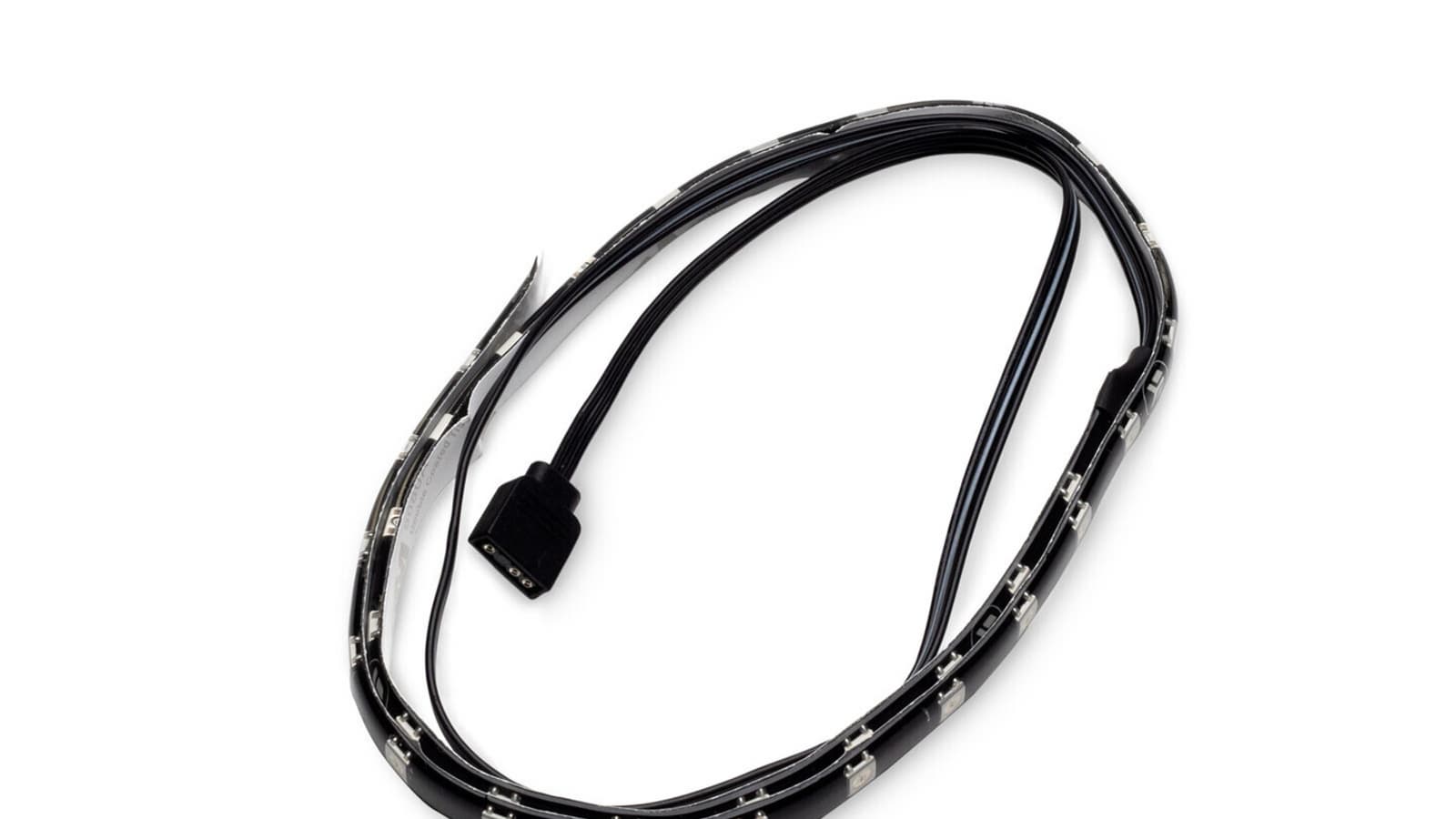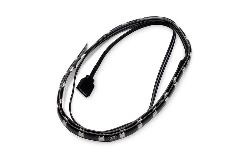 Первая новинка — EK-Loop D-RGB LED Magnetic Strip (600mm) — магнитная лента длиной 600 мм с адресуемыми светодиодами, которая подключается к системной плате или контроллеру D-RGB через стандартный 3-контактный разъём 5 В. Она характеризуется плотностью 54 светодиода на метр. Всего на ленте установлено 33 светодиода. Основной вариант крепления на корпусе ПК — это магниты, но есть и альтернативный вариант. Это липкая лента, которая позволяет приклеивать новинку к поверхности. Светодиодная лента стоит 14,90 евро. Она заключена в силиконовую оболочку, которая улучшает однородность света и защищает светодиоды.