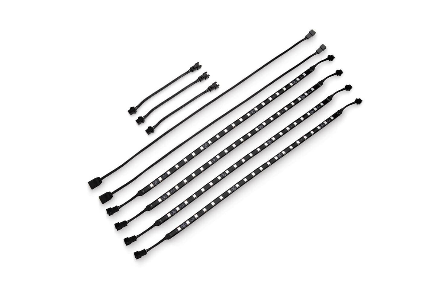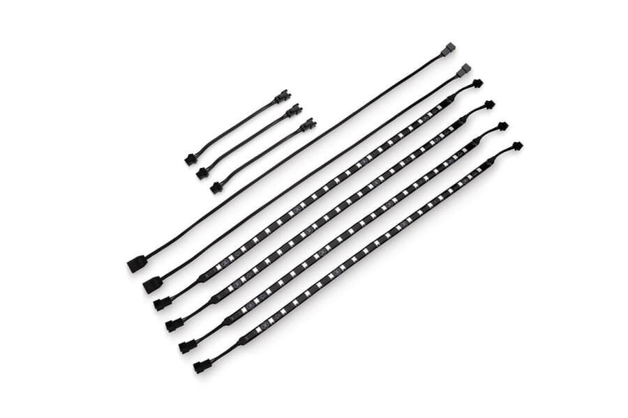 Вторая новинка — EK-Loop D-RGB LED Magnetic Kit (4pcs 400mm) — набор из четырёх магнитных лент длиной по 400 мм с адресуемыми светодиодами. Их можно подключать отдельно или последовательно. В любом случае для подключения к системной плате или контроллеру используется стандартный 3-контактный разъём. Эти ленты имеют плотность 51 светодиод на метр. Каждый отрезок украшен 21 светодиодом. Как и в первом случае для крепления к корпусу можно использовать магниты или липкую ленту. Светодиодная лента имеет силиконовую оболочку, повышающую однородность света и защищающую светодиоды. Набор стоит 50,90 евро.