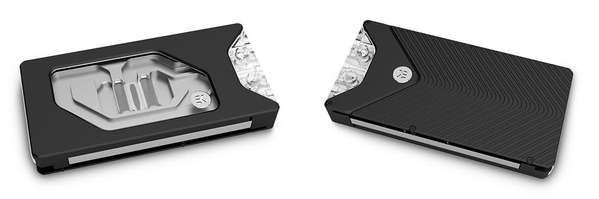 Водоблок отводит тепло от GPU, микросхем памяти и компонентов подсистемы питания. Его основание изготовлено из меди. Конфигурация каналов выбрана с таким расчётом, чтобы исключить возникновение возмущений и мертвых зон в потоке охлаждающей жидкости. Схема каналов Open Split-Flow имеет низкое гидродинамическое сопротивление, поэтому водоблок можно использовать даже с помпами небольшой мощности. Кроме того, он одинаково эффективен при любом направлении потока. Терминал расположен на торце водоблока. В нём есть шесть портов G1/4": два — сбоку, два — сверху, два — снизу.