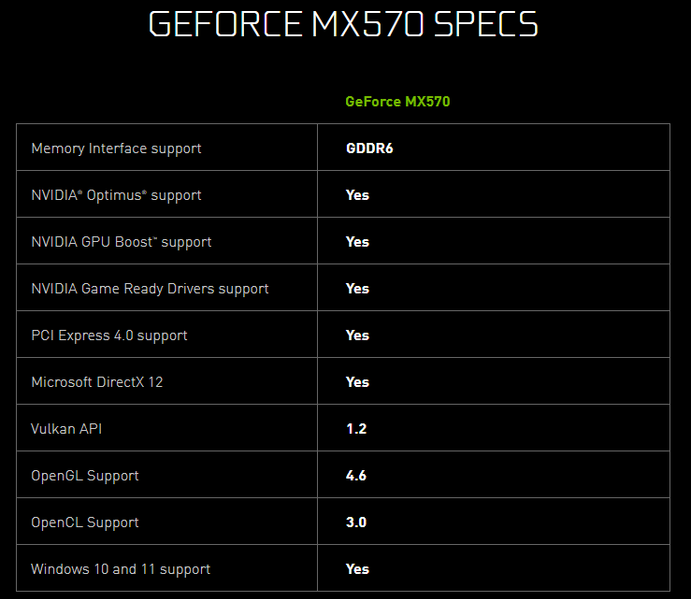 Все характеристики MX570 и MX550, которые пожелала сообщить Nvidia, представлены на двух картинках ниже. Как видно, ни частоты, ни даже объемы памяти компания раскрывать не стала. Судя по всему, полные подробности появятся весной 2022 года вместе с ноутбуками с этими dGPU.