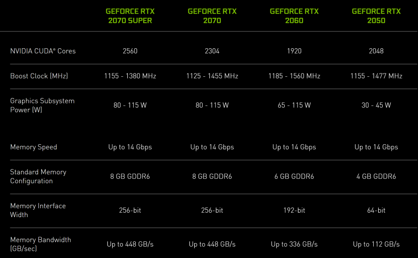 А вот характеристики GeForce RTX 2050 опубликованы. Она получила 2048 ядер CUDA и 4 ГБ памяти GDDR6 частотой до 14 ГГц. Ширина шины памяти – всего 64 бита, так что пропускная способность памяти невелика – 112 ГБ/с. TDP варьируется в диапазоне от 30 до 45 Вт, частота GPU – от 1155 до 1477 МГц.
