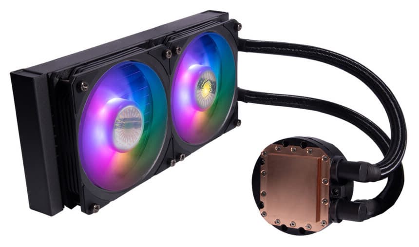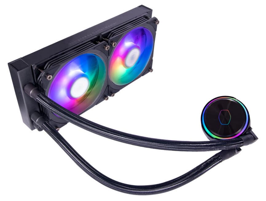 На радиаторах закреплены специально разработанные вентиляторы. Концы лопастей у них соединены в кольцо для большей жесткости на высоких скоростях, а внутренний обод рамки имеет уклон, что, как утверждается, позволяет увеличить приток воздуха. Вентиляторы и помпа украшены адресуемой подсветкой. Ею можно управлять с помощью прилагаемого контроллера Addressable Gen 2 RGB или программного обеспечения Cooler Master MasterPlus.