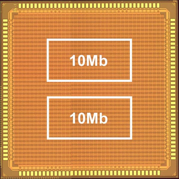 На тестовой микросхеме со встроенным массивом ячеек памяти MRAM размером 20 Мбит, изготовленной с использованием 16-нанометрового техпроцесса, применяемого для изготовления логических микросхем с транзисторами FinFET, было подтверждено уменьшение энергии записи на 72% и сокращение времени подачи напряжения на 50%.