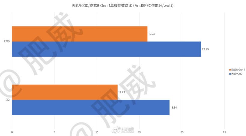 И вот еще интересные слайды, демонстрирующие энергоэффективность систем. Тут по чистой производительности ядра Cortex-A710 в Dimensity 9000 обходят аналогичные ядра в Snapdragon 8 Gen 1. Производительность в пересчете на ватт у Dimensity 9000 выше как по ядру Cortex-X2, так и по ядрам Cortex-A710.