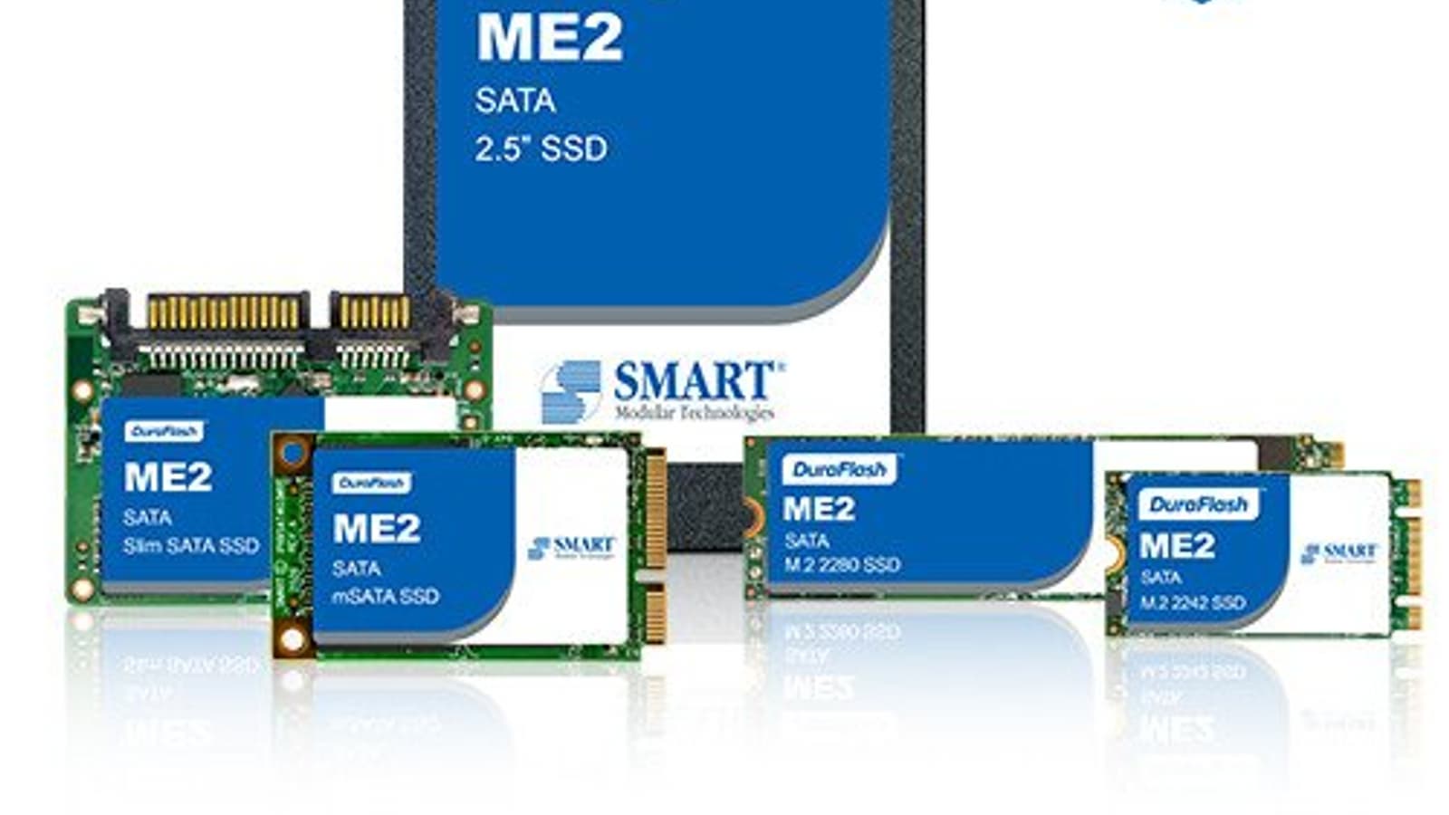 Компания Smart Modular, специализирующаяся на выпуске решений для хранения данных, объявила о расширении линейки продуктов DuraFlash ME2 SATA твердотельными накопителями трех типоразмеров: M.2 2242 SATA, mSATA (MO-300A) и Slim SATA (MO-297A). Эти изделия присоединились к ранее выпущенным SSD M.2 2280 и типоразмера 2,5 дюйма с интерфейсом SATA.